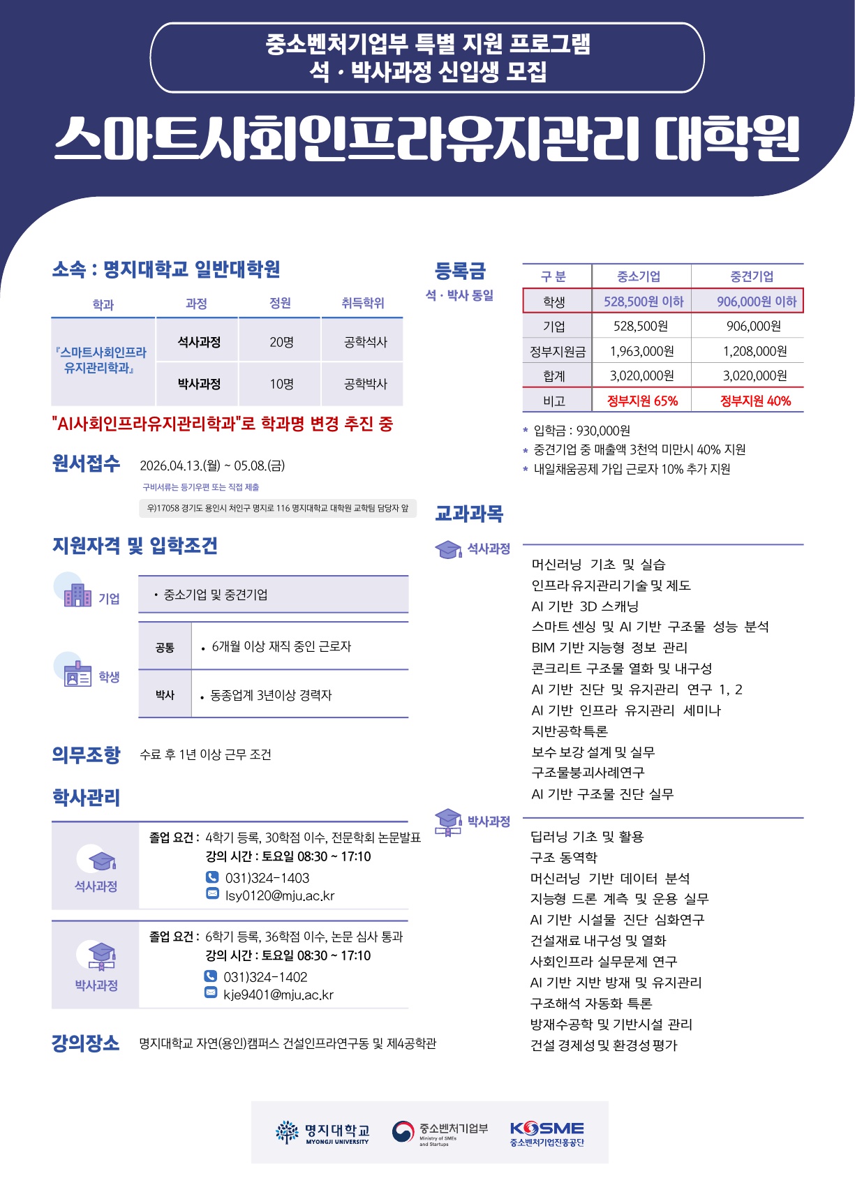 2026학년도 후기 명지대학교 대학원 AI사회인프라유지관리학과(前 스마트사회인프라유지관리학과) 석사 및 박사과정 신입생 모집 안내