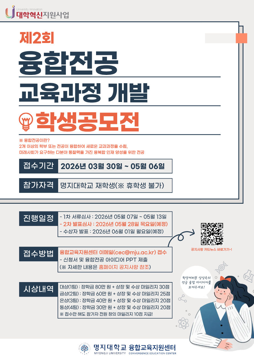 명지대학교 융합교육지원센터에서는 학문 간 경계를 넘는 창의적 인재를 양성하고 수요자 중심 교육 선택권 강화를 위해 ‘2026학년도 융합전공 교육과정 개발 학생공모전’을 개최하오니 많은 관심과 참여를 바랍니다.